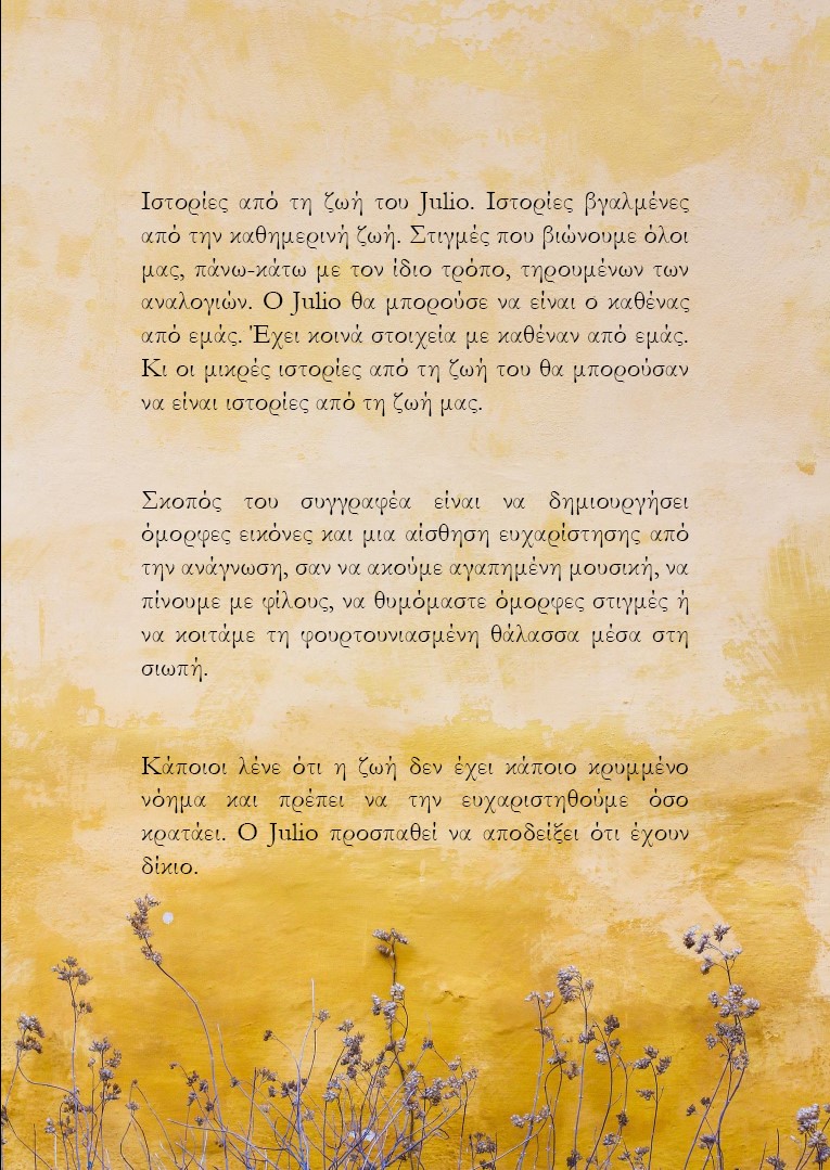 Ιστορίες από τη ζωή του Julio. Ιστορίες βγαλμένες από την καθημερινή ζωή. Στιγμές που βιώνουμε όλοι μας, πάνω-κάτω με τον ίδιο τρόπο, τηρουμένων των αναλογιών. Ο Julio θα μπορούσε να είναι ο καθένας από εμάς. Έχει κοινά στοιχεία με καθέναν από εμάς. Κι οι μικρές ιστορίες από τη ζωή του θα μπορούσαν να είναι ιστορίες από τη ζωή μας.
